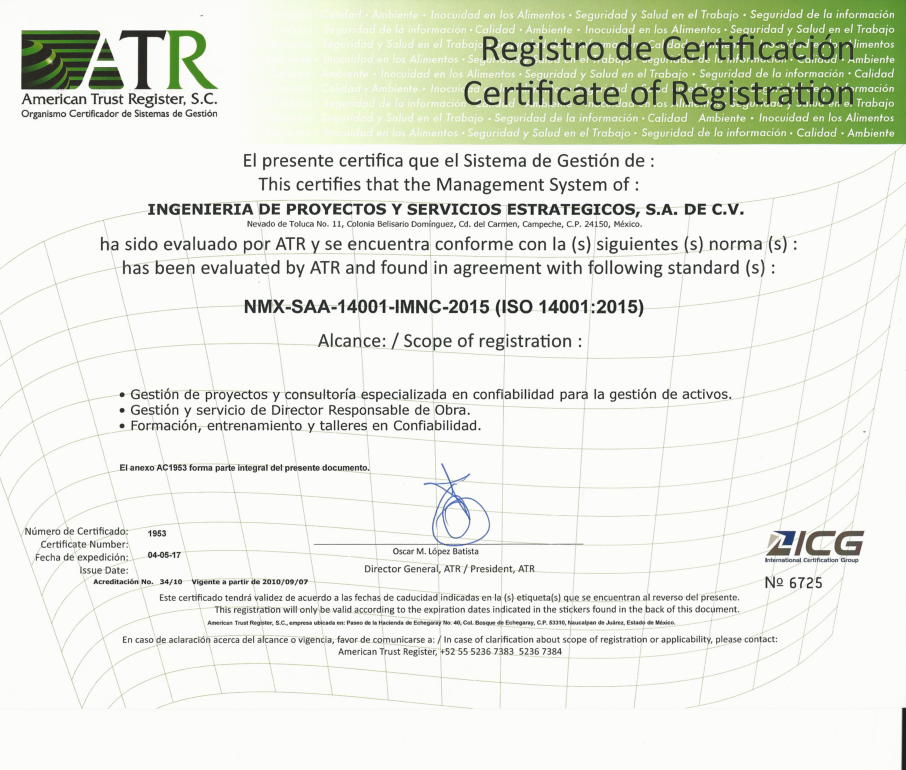 Ingeniería de proyectos y Servicios estratégicos, S.A. de C.V. Has the NMX-SAA-14001-IMNC-2015 (ISO 14001:2015) for: